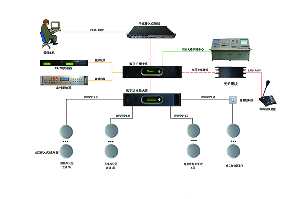 近年來,辦公大樓、購物中心和其他大規(guī)模建筑工程對(duì)于公共廣播系統(tǒng)能夠具備呼叫分配、播音、背景音樂及對(duì)建筑物內(nèi)的特定區(qū)域進(jìn)行常規(guī)信息播放的功能之要求日益增加。科海辦公樓廣播系統(tǒng)的設(shè)計(jì),順應(yīng)潮流和科技發(fā)展趨勢(shì),從投資合理、外觀美觀、設(shè)計(jì)規(guī)范的設(shè)計(jì)原則出發(fā),要求廣播系統(tǒng)具備如下功能:①兼顧背景音樂、公共廣播、消防廣播的功能;②全數(shù)字結(jié)構(gòu);③結(jié)合防火分區(qū)劃分廣播分區(qū);④各廣播分區(qū)獨(dú)立音源、獨(dú)立廣播;⑤緊急廣播具備優(yōu)先控制權(quán)。