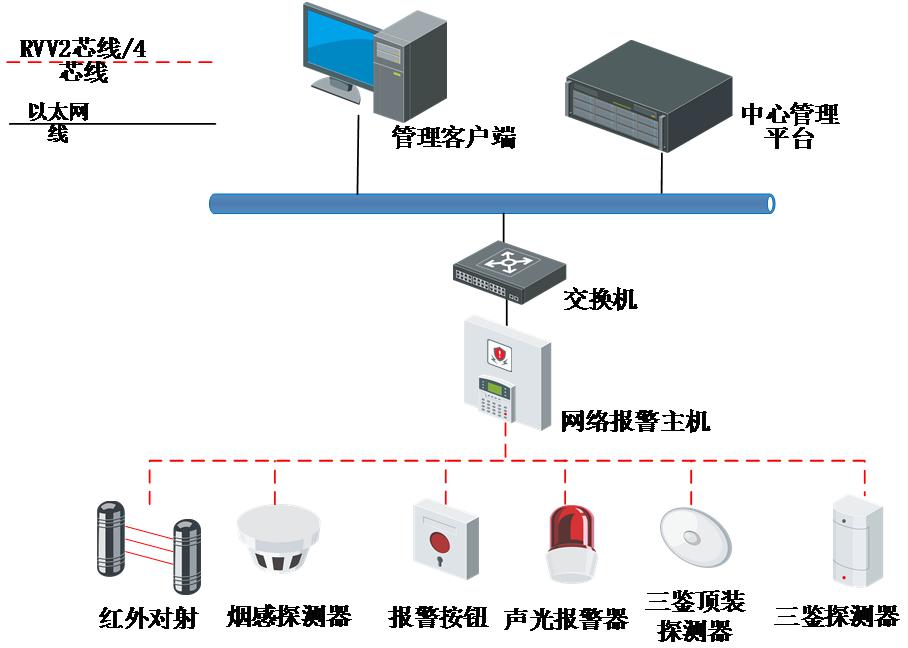 緊急報警按鈕、紅外雙鑒探測器、煙感探測器等前端報警采集設備通過RVV2芯/ RVV4芯線纜接入部署在機房的報警主機。